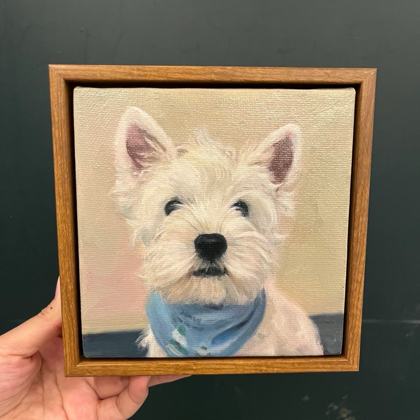 Before shipping, we perform a final check in both daylight and warm indoor light to ensure true color at home, photograph your portrait, and pack with corner protection.