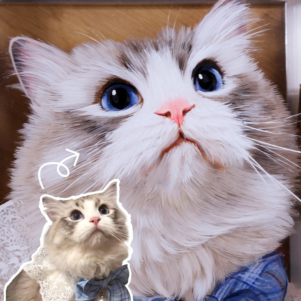 Next, we build layer by layer: broad shapes first, then the flow of fur, and finally the tiny things—whisker roots, nose texture, catch-lights in the eyes. Edges are softened where the piece should feel cuddly, and sharpened where the likeness needs to pop.